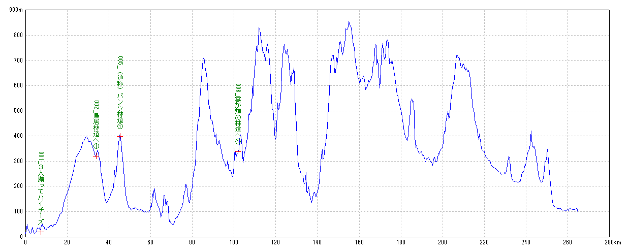 | 地点名 | 通過時刻 移動時間 | 積算距離 区間距離 | 平均速度 | 標高 獲得標高 | 平均勾配 |