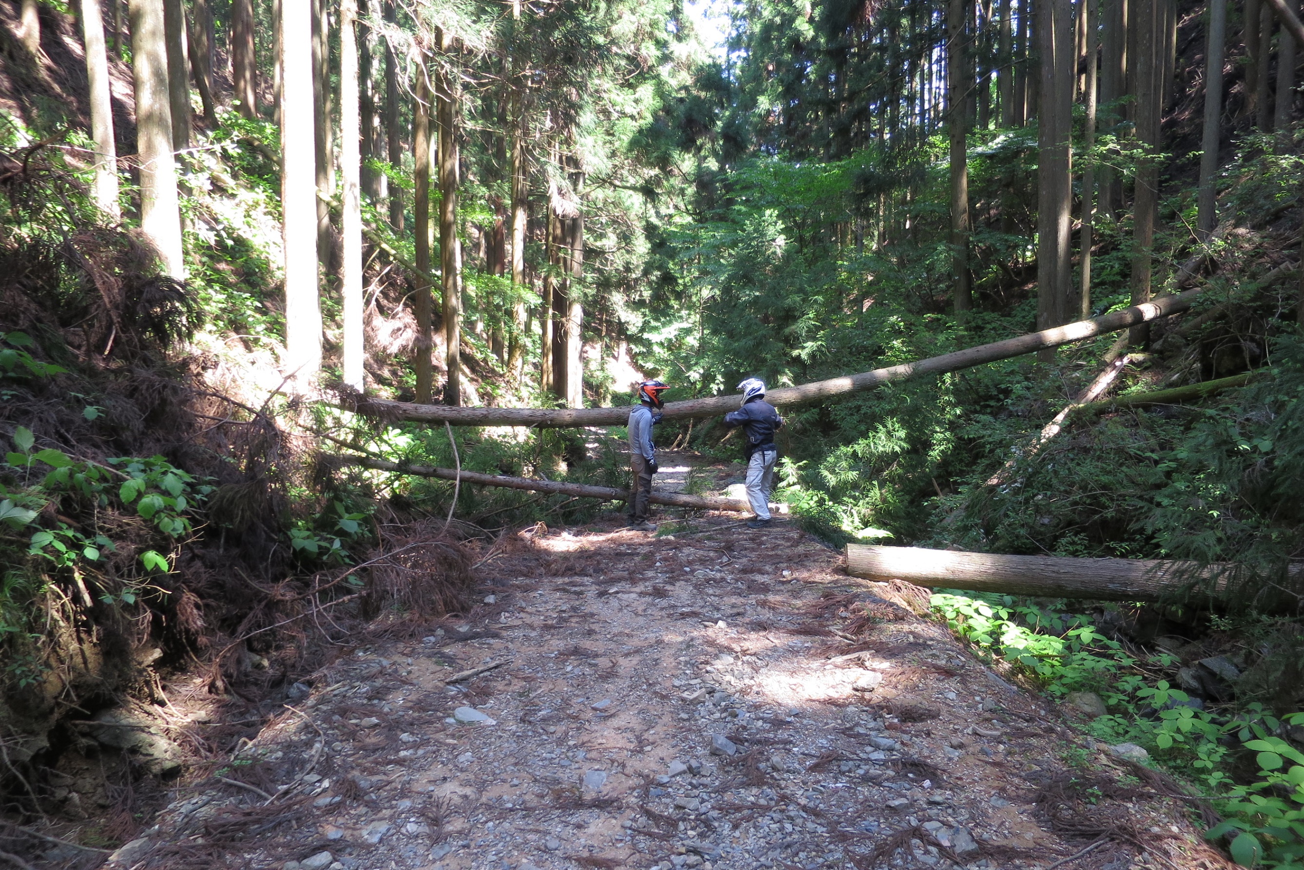 (画像クリックで拡大)仮称ウジウジ峠の林道にやってきまして、枝道の林道も走りつつ本線に戻って、そろそろ林道が終わるかなぁという場所に道をふさぐように倒木がありました。これも昨秋の台風の爪痕でしょう。