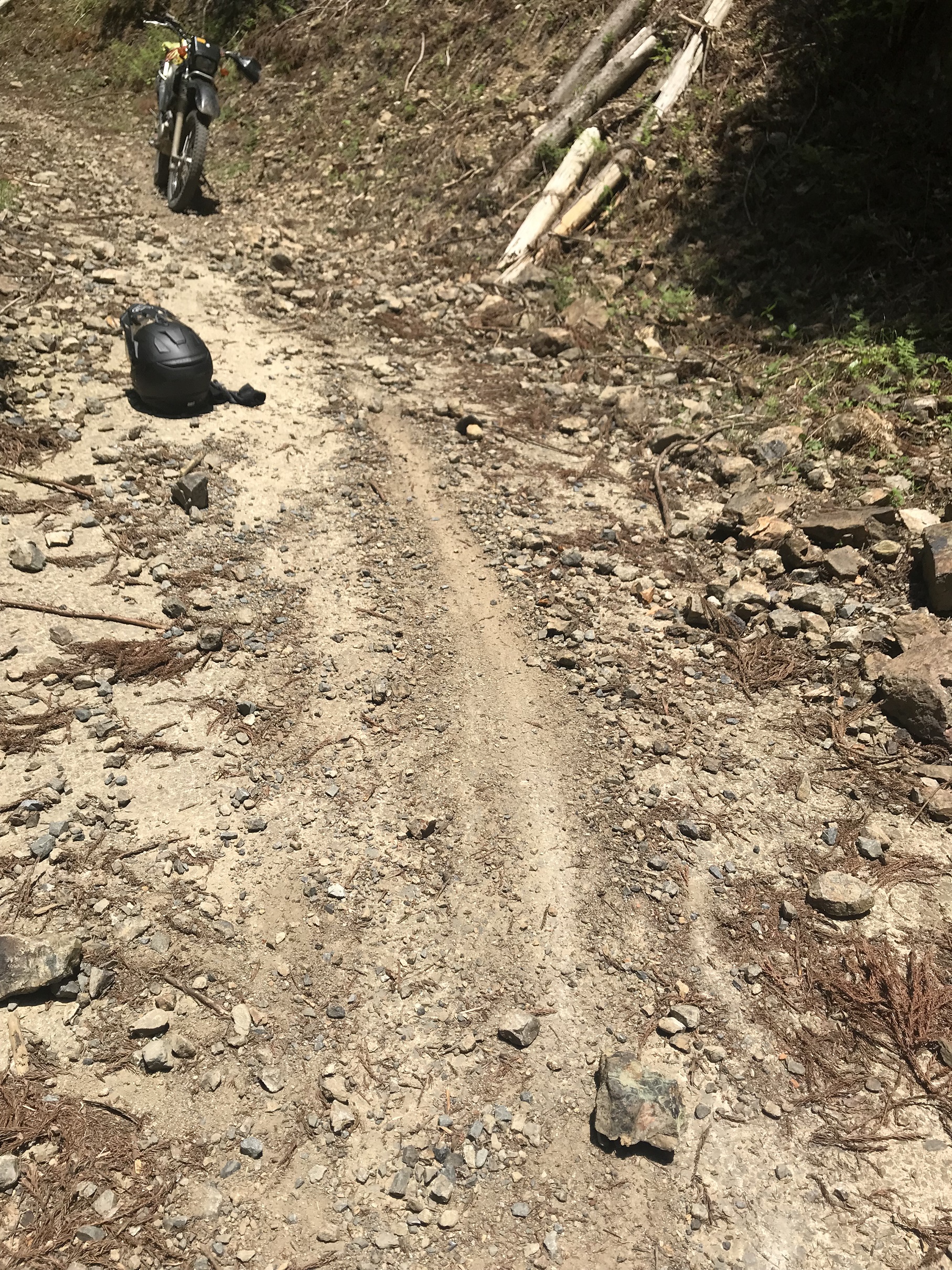 その洗い越しを超えて、さらに続いていた道がこちら。雨が川のようになって道がえぐれるということが繰り返された感じですね。右のラインを使って抜けました。