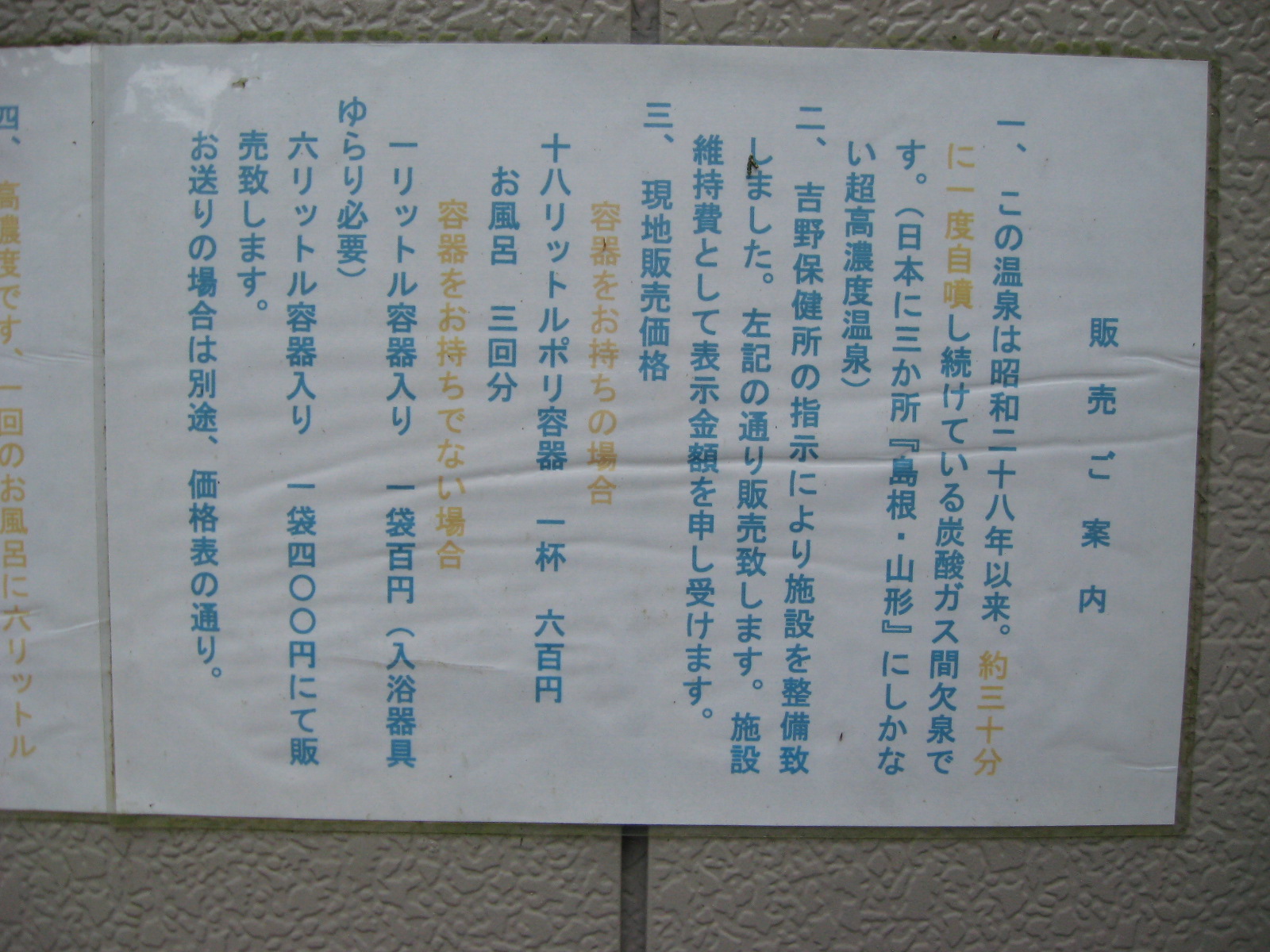 (クリックで画像拡大)どうやら温泉が湧いているようです。【炭酸ガス間欠泉】だそうです。販売もしているのですねぇ。