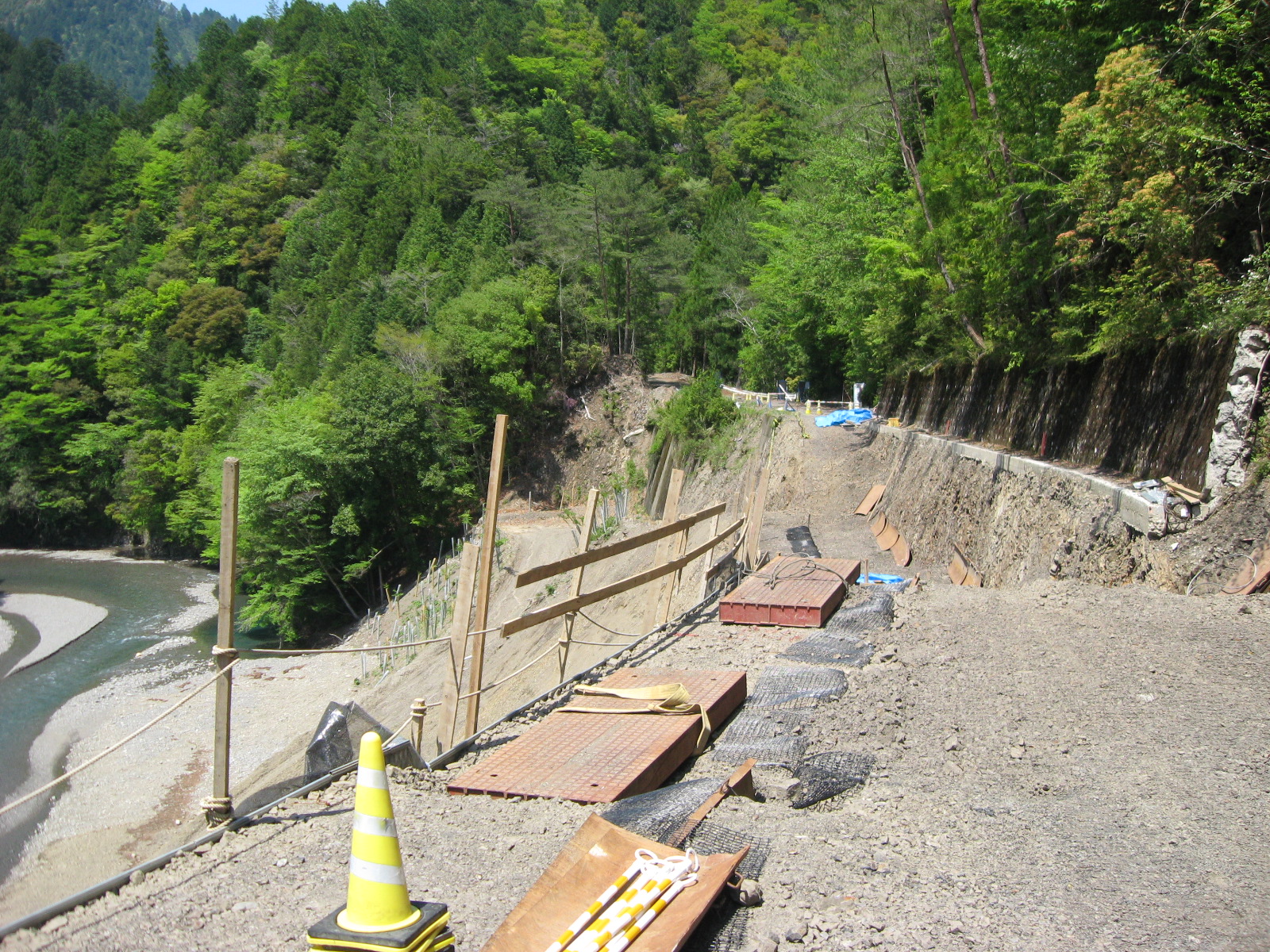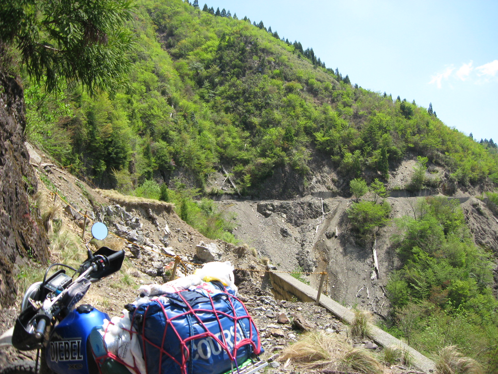(クリックで画像拡大)入り口から200mほど行ったところで林道が崩壊していた。工事の途中で、崩壊した場所を深く掘って基礎の部分から立て直している状態だったため、バイクでも、さすがに通れる状況になかった。13:00ごろのこと。
