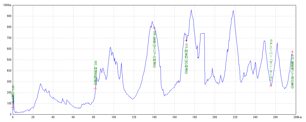 | 地点名 | 通過時刻 移動時間 | 積算距離 区間距離 | 平均速度 | 標高 獲得標高 | 平均勾配 |