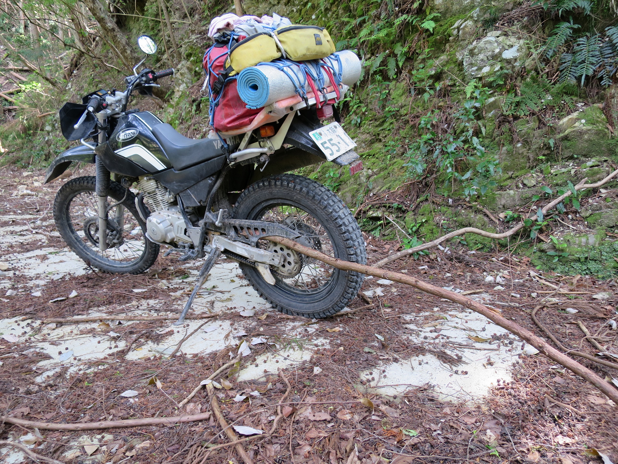 高尾トンネルの先に広がる林道「その2」。広見川林道です。片道7km程度のピストン林道でした。最初は走りやすかったのですが、行き止まりに近づくと大きな石(岩)がごろごろと落ちており、さらには、激しい雨のせいでメットのバイザーが曇ってしまい、非常に走りにくかった記憶があります。写真はその行き止まり箇所にて。