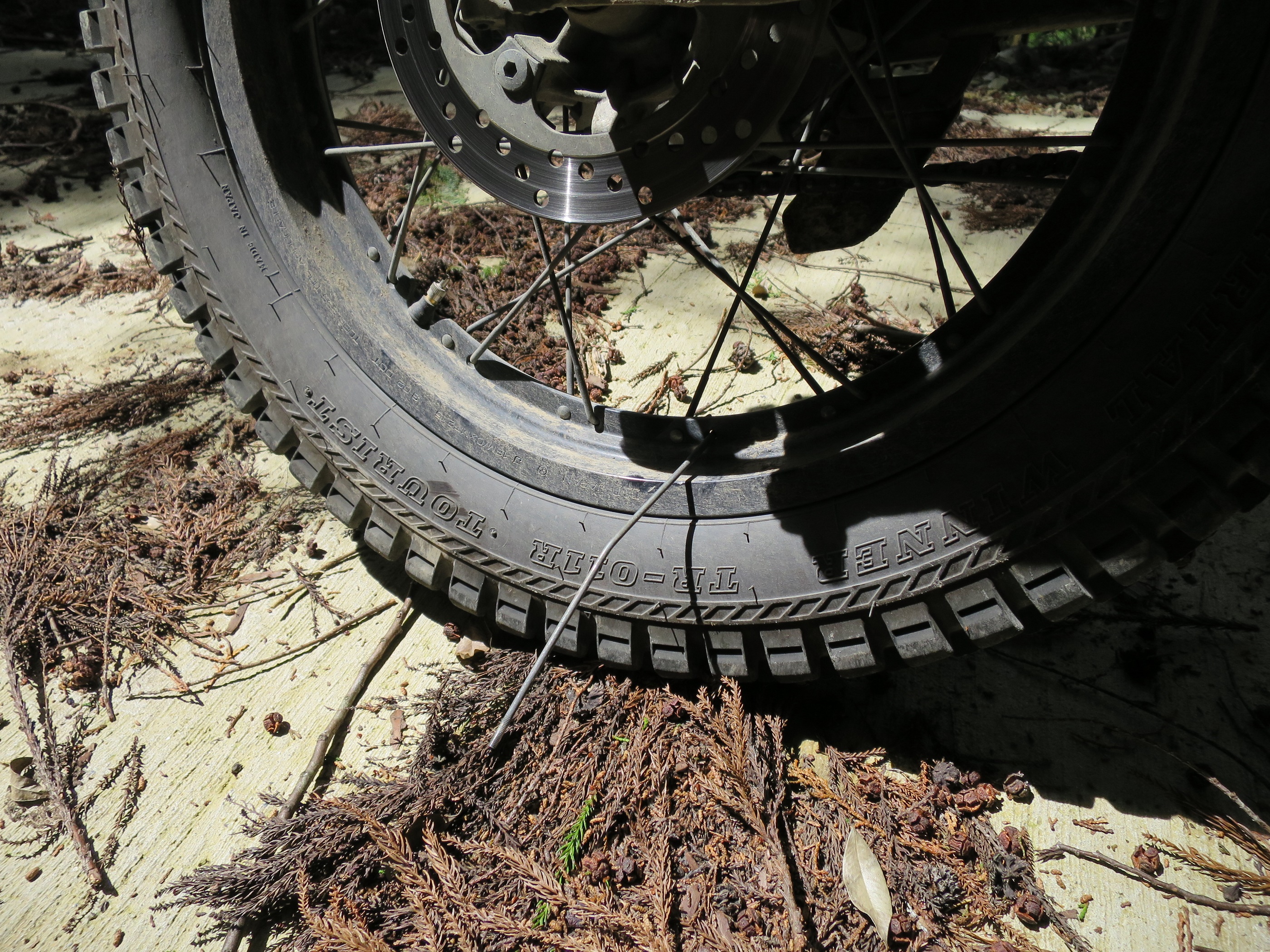 (画像クリックで拡大)気づいたら、スポークが折れていたそうです。どうやら枝をはずしたときにスポークに引っかかり挙句の果てにスポークとリムを繋げているネジ部から折れてしまったようですした。こりゃ、災難でした。1本折れただけなら差し支えなく走れますよねってことでそのまま走行しました。