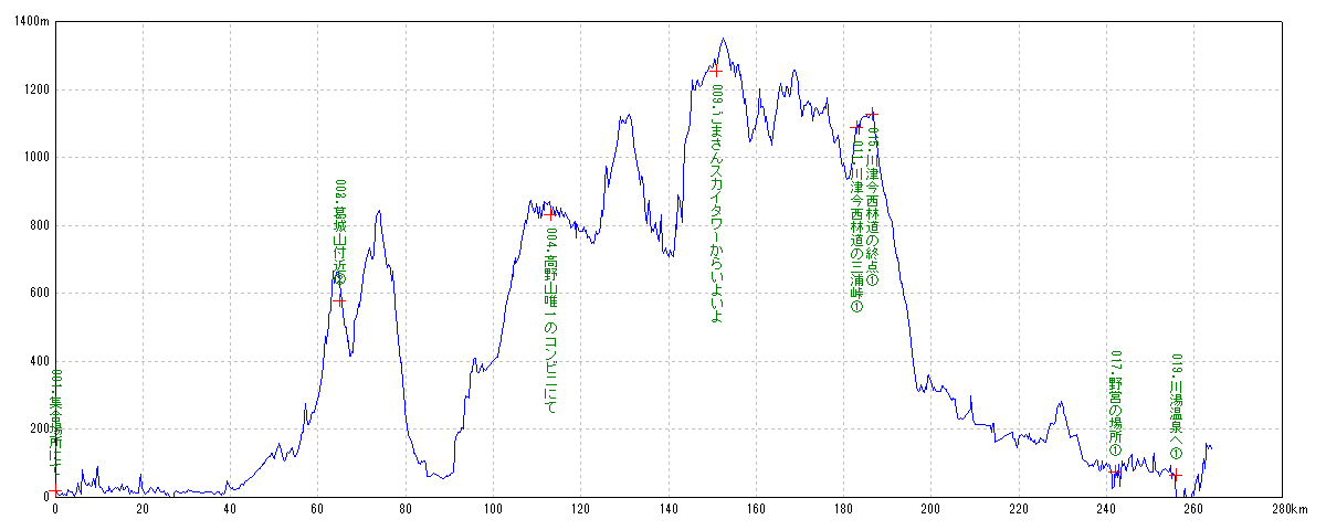| 地点名 | 通過時刻 移動時間 | 積算距離 区間距離 | 平均速度 | 標高 獲得標高 | 平均勾配 |