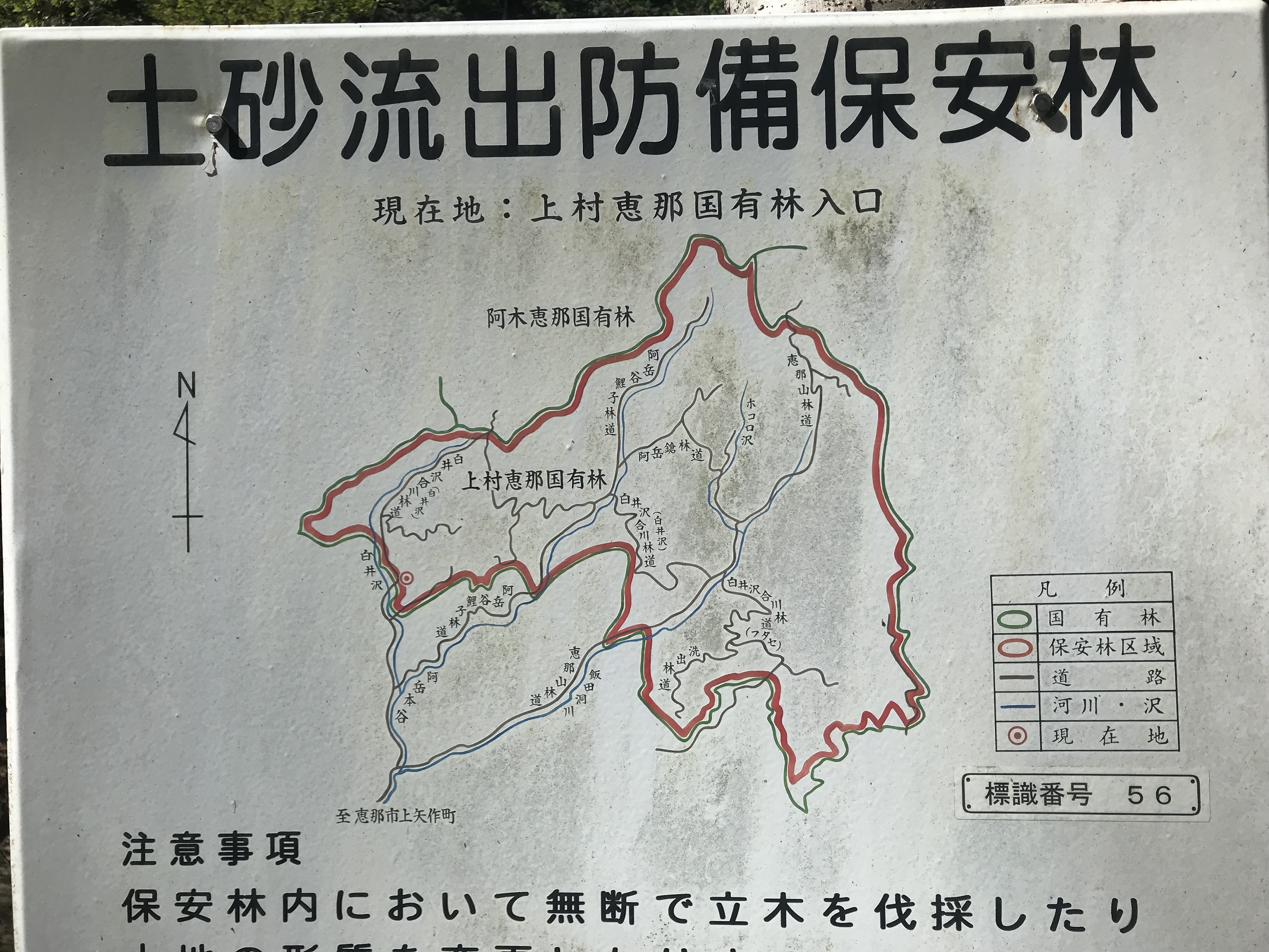 そこに設置されていた看板。左の加子母(かしも)から来て、右の中腹林道へ進んでいきます。