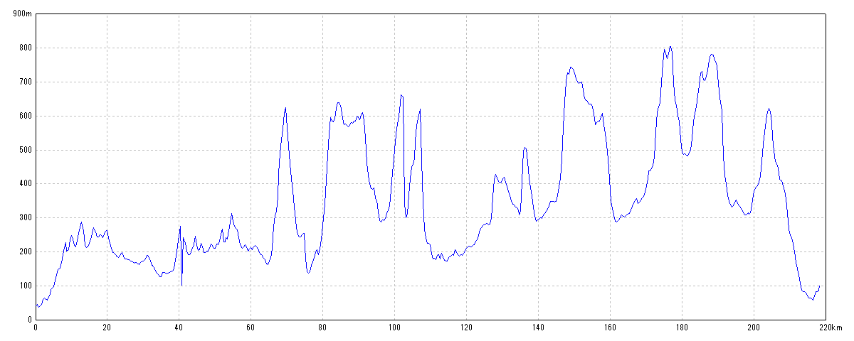 | 地点名 | 通過時刻 移動時間 | 積算距離 区間距離 | 平均速度 | 標高 獲得標高 | 平均勾配 |