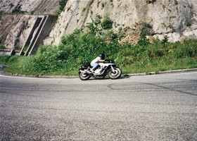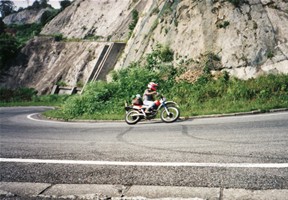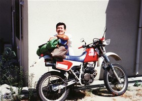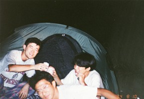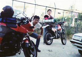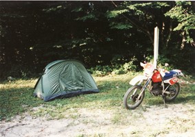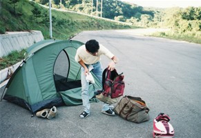 秋田県まで下りてきて深浦(ふかうら)でもう5時。宿を探すことにしました。山手に入ってすぐにおあつらえ向きの場所発見。テントを張ってビール、飯。さあ、寝よう。ってラジオを聴いていたら突然車が来た!やばいかなぁ。角材を「ごろん、ごろん」と落とす音。「不法廃棄か?」っておもっていたら突然火がついた。どうやら同士らしい。「明日も早いし、寝ておこうっと」。、、、じゃりじゃりとこっちに陰が来る。「誰か泊まってるんか?」「はい」「おお、兄ちゃん。アッチで今飲んでるから一緒に飲もうや」「いいんですか?」「おう、来いや」ってことで、年が40~50のワイルドアウトドア系おじさん2人と私と、3人で再び酒飲みになってしまいました。「あんたも大阪か。俺らも大阪や。夕べ出発して夜中じゅう走り回って、今日はここで泊まるんや」、「半端やないでぇ」、「はぁどうもどうも」と注がれるのは濃い~焼酎のコップ酒。つまみはこれまたおじさん、お手製のスモークチキンときたもんだ!まあ、飲んだ飲んだ。94/08/14(5日目) 翌朝は当然頭がボー、、。二日酔いの頭をひっさげてバイクに乗ることとなってしまった、、、。 何と今日は秋田~名古屋の強行軍。友人の家に泊まる約束だったのでどうしてもたどり着かねば、、ひたすら日本海側を疾走。富山から高山を経由して夕方4時に名古屋着。久々に大黒柱のある屋根付きのテント(???)に泊まれました。 94/08/15(6日目) 後はおうちにかえっておしまい。(尻切れトンボ)
