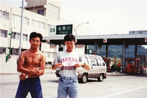 途中大津~米原JCまでの間小雨が降るというアクシデントもありましたが、合羽を着る程度のこともなく、そのまま小雨に打たれて「気持ちいいぜ!」とばかりに距離を稼ぐのでした。道中、北上しているはずなのに気温は上昇の一途。29℃だったものが36℃まで跳ね上がり、不快指数は増す一方。SAに止まる度に「暑い」思いをしていたのでした。金沢ICでマーケ部隊とさよならした2人は、全くペースが違うためSAでおちあう作戦に出るも、あまりに違うペースのため待つ方は待ちくたびれ、追う方は付いたらすぐに出発と両者共にさんざんの走りとなりました。やっとの思いで着いた糸魚川SA。ここで高速道路とはさよなら。既にTシャツは排ガスまみれで真っ黒。悲しくも2人は料金所で”おのぼりさん”宜しく写真を撮るのでありました。 その後は、R8→R352→R402とひたすら北上して、延々と新潟を目指す。どうやらこのルートは裏道になるらしく、高速と同じくらいのペースを維持できて快適な一般道でした。丁度18:00新潟駅着となりました。セイジ君(初登場!コータ君の弟だよ。三重県から参加してくれました)とここで待ち合わせしていたのですが、来ました来ました。”刀”に乗って無事到着。晴れて兄弟の再会(ウルウル、、)を果たしたのです。汚い格好の我々は周りの人の視線にちょっとビビリながらも駅前の立ち食いそばで、ちょっと遅い夕食を食べました。 阿賀野川がすぐ近くにあり、それがずいぶん大きい川なことをいいことにその下でテントを張ることして、ビールを調達。即いつもの宴会です。私松本はセイジ君と初対面。ちょっとニヒルな感じの彼でしたが話せばただのバイク野郎、飲み野郎。つまみとビールをかっ食らっているうちに眠くなって寝てしまいました。(at20:00) 94/08/11(2日目) 朝5時に起床。外は既に明るくて気温もまだ上がっておらず気持ちの良い朝。やっぱり外での朝は最高です。早々にテントを片づけて6:00出発。まずはラーメンの有名な喜多方を目指す。7:30には近くまでたどり着くが、当然ラーメン屋はやっていない。どうしようか~と話していたら、近所(?)のおじさんが「どうしたのさ?」「喜多方でラーメン食べたいんだけど、まだやってないっしょ」「そうだなぁ。したら近くにイレブンセブン(!!)あるからそこで食ったらいいべさ」方言丸出しのやりとりをして分かれました。当然その後みんなで笑ったのは言わなくてもわかりますね。