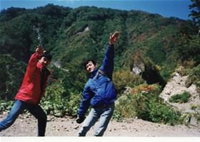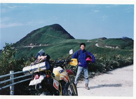 94/09/23(1日目) いつものように松ちゃんの寝坊で始まった本日。6:30コータ君の「、、、、起きて下さい。」に始まる朝を迎える私(情けない)。あわてて支度を整えると、丁度寮母さん(我々はこのとき会社の寮に住んでいました)と同じ朝。「ご飯食べて行きなさい」と言われ、更に出発の遅れる2人。結局7:15出発。 国道2号線を一気に西へ。明石まで約1時間。折角早く付いたのに淡路島へ渡るフェリーは30分待ち。仕方なく、一緒に乗り込むであろうバイク仲間と話をして盛り上がっていました。 乗船。普段ならバイクは紐で動かないように固定されて、人間はゆっくり出来るのですが、10台以上が一気に乗船したため、紐が足りないようで、「バイクの方は各自で支えていて下さい」との指示。悲しいかな海の景色は見れず、排ガス臭さにまみれながら淡路島へと着いたのでした。9:15分着。