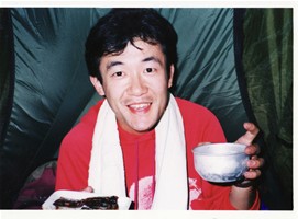 本来なら、四万十川の沈下橋へ向かおうとしていたのですが、時間の制約もありヤメ。一路高知を目指すことにしました。高知ではやっぱり鰹のたたき!とばかりに港へ出向くも、喫茶店しかありません。仕方なく入って頼んだ「たたき定食」。これがうまかった。やっぱり本場で食うものはいいものだと実感した2人でした。桂浜などのメジャー路線を観ながら、次の日に予定している剣山スーパー林道の導入口となる「張川林道」を目指すも、今回の責任先頭(我々のローカルルール。先頭者は行く道を決めることが出来る。後ろを走る者は先頭者が道間違いしても絶対に責めてはならないし、先頭者の決めた道に対して反論してはならない)である松本の道間違いにより、林道手前でDown!河原でのキャンプとなりました。