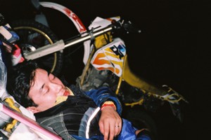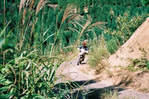 99/10/10 翌朝は、ちょっと遅めの8時起床。珍しく日が昇ってからの起床。眠い目をこすって寝袋から起きて着ると、「松ちゃんさん、目が腫れてますよ」とコータ君。バイクのミラーで見てみると、左目が”お岩さん”状態。コータ君も左耳がはれています。どうやら、昨日暖かいことをいいことに、寝袋のみで寝てしまったので、蚊に刺されたようです。やむなし・・・。朝食は昨日買っておいたパンと水・水・みず!。ささっと片づけを済ませて9時には出発。ここからは福井県が一生懸命作った「広域基幹林道越後西部線1~3号」が連続しているんです。前に来たのは3年前ほど。さてどこまで舗装が進んでいるのやら、、