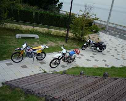 00/10/27 今回からメンバーが1人増えました。その名は”トドロッキー”です。バイクに乗っているとのことで今回一緒に走ることになりました。ロード系のW650に乗っての参加です。 確か各自準備をしたうえで会社に向かったと思います。仕事終わってそのまま出発。18:30頃の出発だったと思います。淡路島で宿泊の予定として、たこフェリーに乗るべく明石へと向かう。さすがにおなかが空いてきたので、明石焼きを買ってから”たこフェリー”へ乗船。確かこの時点で22時を超えていたはず。 00/10/28 翌朝、場所が場所なので早々に出発。残っている写真を見ると雨模様の中の出発となっていたようです。 我々3人はそのまま徳島方面へ向かい、初体験となる”徳島ラーメン”を食しました。その後は、ロード派とオフ派に分かれて、夕方にどこかで待ち合わせしましょうとして、しばしの別行動に。