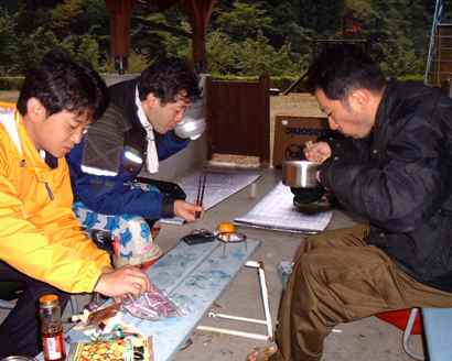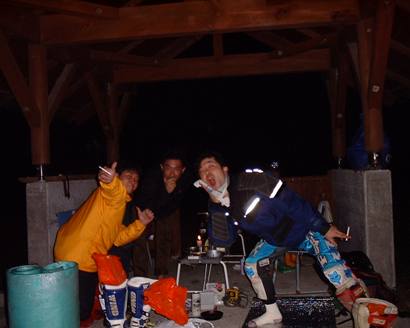 オフ派の松ちゃんコータ君は、どこを走ったか忘れましたが、当然林道へ向かいました。一方トドロッキーは、多分夜の宴時に聞いたはずなのですが忘れてしまいました(ゴメン)。ちなみに天気は、昼~夕方にかけて雨が振り出したはずです。しかも雨足はきつくなる一方だったと思います。今日は屋根付きの宿が必須となる模様。 程なく屋根つきの東屋を見つけ幕営、そして宴へ。トドロッキーがチョイスしてくれた焼肉系の食材、その他etc.を食べながら、トドロッキーの大遅刻の件は和解となりました。写真の記録日時を見ると22:30まではおきていましたので、恐らく24時ごろに寝たと思います。