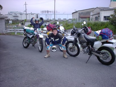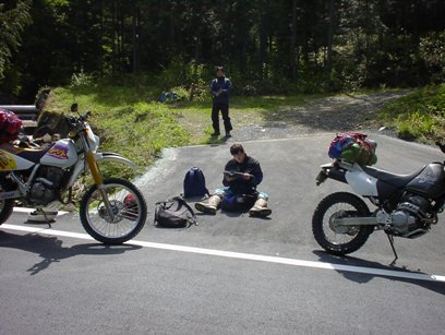 さて、本日からいよいよ本格的な林道走行が始まります。7:30松ちゃん起床。既にコータ君、トドロッキーは起きており、出発体制もある程度えて、余裕の会話中。松ちゃんは眠い目をこすりながら2人のペースに追いつけ追い越せと頑張り、8:00には全員片づけを終えて出発!