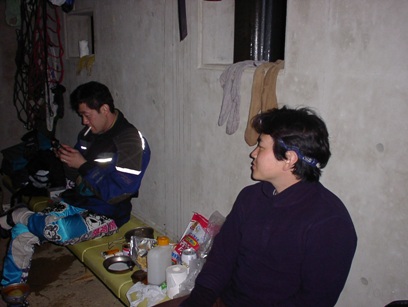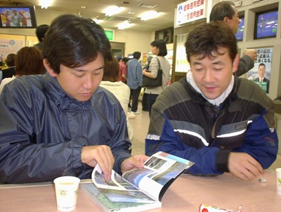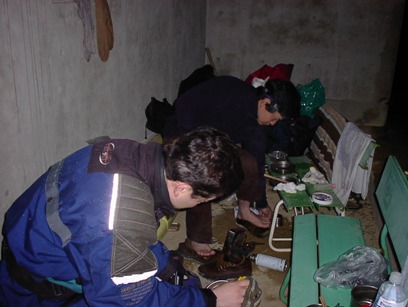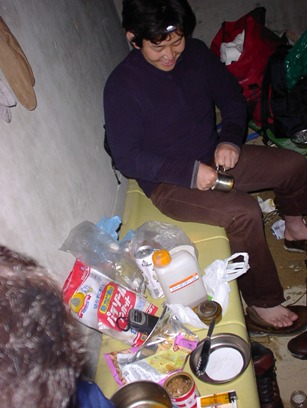 さて、今回の旅で、各自ニューアイテムを持参した模様。 ・「不織布マフラー」 :会社で捨てられていたロールになった不織布を、約1.3mカットしたもの。 ・「コンパクト三脚型いす」 :400円のコーナン品。夜の宴の腰痛対策とのこと。 ・「ニュースリッパ」 :何のことはない、スリッパを新調しただけのこと。 といったところである。各自、工夫の賜物といったところだろうか?