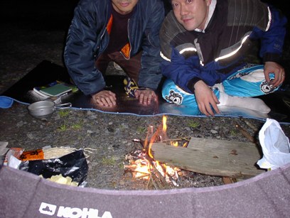 伊那ICで高速を降りて、付近で見つけた「大井ダム」の駐車場を拝借して、本日の幕営地としました。ビールを片手に歩いてくる地元のリーマン(と思しき方)と2度も遭遇し、リーマンの方にビビられながらもテントを設営。小さな焚き火をさせていただいて、トドロッキーの彼女の話などを肴にトロトロと酔い始める3人。結局1:30まで飲んで、寝ることになりました。