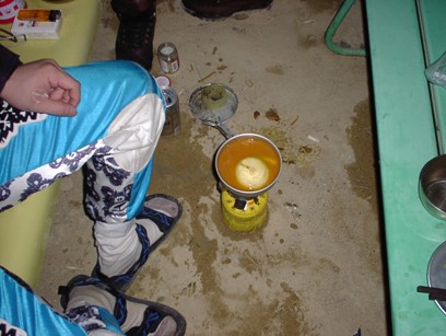 この時点で時間は既に夕方だったので、近くで宿を探すことに。(確かこの日は、昼過ぎか夕方から雨に降られた日だったと思いますが)、白川村の平瀬温泉にあったグラウンドを宿とさせていたただくことに。雨の中、1塁側ベンチで凍えながら宴会をしました。みんな足元がずぶぬれだったので冷えたんですね~。写真を見ると玉ねぎを丸ごと、コンソメスープで煮込んだスープもどきを作ったようで、これを飲んで温まったのでしょう。